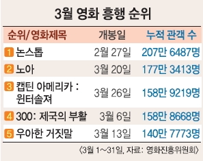 실제로 지난해 3, 4월에 1편꼴로 개봉했던 할리우드 외화는 올해 한달에 3~4편으로 늘었다. 지난해는 4월 말쯤 시작됐던 할리우드 블록버스터의 개봉일도 한달 이상 앞당겨졌다. 그 결과 3월 흥행 성적 1~4위는 모두 외화가 휩쓸었다. 지난달 26일 개봉한 ‘캡틴 아메리카:윈터솔져’(캡틴 아메리카2)는 개봉 일주일도 안 돼 150만명을 동원했다. 지난달 20일 개봉한 ‘노아’도 성경 왜곡 논란 속에 177만명을 동원했다. 외화 ‘논스톱’과 ‘300:제국의 부활’도 각각 200만, 150만을 넘기며 기대 이상으로 선전했다. 대작들 틈새에서 다양성 영화 ‘그랜드 부다페스트 호텔’도 30만 돌파를 앞두고 있어 극장가 봄 비수기 통념을 깨고 있는 중이다.