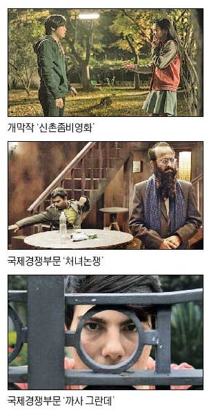 개막작으로는 류승완·한지승·김태용 감독의 3D 옴니버스 영화 ‘신촌좀비만화’(MAD SAD BAD)가 선정됐다. 류승완 감독의 ‘유령’은 2012년 발생한 신촌 살인 사건을 토대로 사춘기의 불안을 강렬하게 스크린에 옮겼다. 한지승 감독의 ‘너를 봤어’는 좀비들이 노동자 계급으로 취업해 치료를 받으며 살아가는 미래를 배경으로 뮤지컬과 호러 등을 버무린 ‘좀비 로맨스’다. 김태용 감독의 ‘피크닉’은 소풍을 나선 남매 중 자폐아인 동생이 사라지면서 벌어지는 이야기를 담았다. 각각 도심과 미래, 산속에서 벌어지는 비극과 환상이 3차원으로 펼쳐진다. 한편 폐막작은 별도로 선정하지 않고 국제경쟁 부문에서 대상을 받은 작품을 상영할 예정이다.