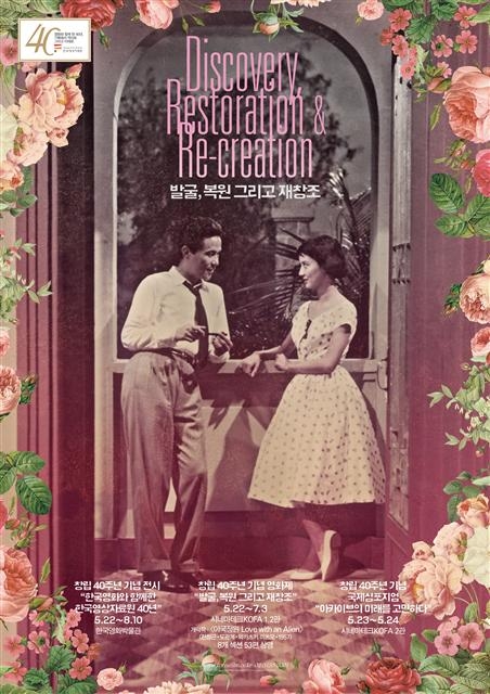 한국영상자료원은 창립 40주년을 맞아 오는 22일부터 7월 3일까지 서울 마포구 상암동 시네마테크 KOFA에서 ‘발굴, 복원 그리고 재창조’ 영화제를 연다. 발굴과 복원, 무성영화, 3D, 극장전 등 7개 섹션에서 국내외 고전 및 예술영화 53편을 만날 수 있다.