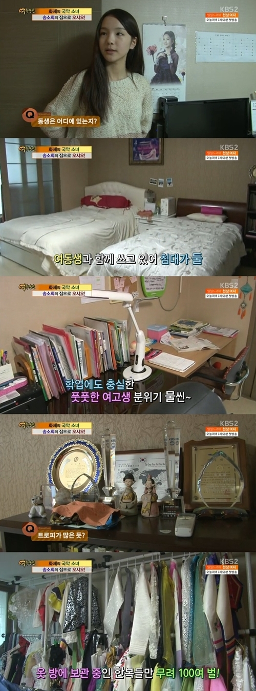 그러나 송소희는 국악소녀답게 각종 트로피와 상장들이 쌓여있는 모습이 카메라에 잡혀 재능 있는 국악인임을 인증했다. 또 송소희 옷 방에는 한복 100여 벌이 정리돼 있어 보는 이들의 놀라움을 자아냈다.
