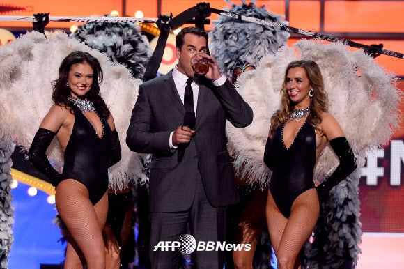 24일(현지시간) 네바다 라스베이거스 MGM 그랜드 가든 아레나에서 열린 북미아이스하키리그(NHL) 시상식에서 배우 겸 코미디언 롭 리글이 미녀들의 도움을 받으며 진행을 보고 있다.