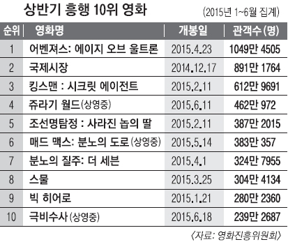 임성규 롯데엔터테인먼트 팀장은 “영화 외적으로 메르스(중동호흡기증후군) 등 요인이 있었지만 그것보다 영화의 콘텐츠 자체가 관객들한테 호응받을 만한 내용을 담지 못한 게 더 큰 이유였을 것”이라고 상반기 부진을 설명했다. 그나마 상반기 영화 시장을 버티게 해 준 것은 ‘애국주의 마케팅’으로 정리할 수 있다. 지난해 12월 개봉한 ‘국제시장’은 현대사의 해석에 대한 논란 및 영화 외적인 평가가 더해지며 노이즈 마케팅의 덕을 톡톡히 봤다. 격동의 현대사 몇 장면을 극화시켜 향수를 자극한 ‘국제시장’은 해를 넘겨 1425만명의 관객을 동원했다. 또한 서울 현지 촬영 때부터 잔뜩 기대를 모았던 ‘어벤져스-에이지 오브 울트론’은 지난 4월 개봉 이후 ‘요란하기만 했던 빈 수레’라는 평가를 받았지만, 마니아들의 변함없는 환호 및 할리우드 영화 속에 비친 한국을 보고자 하는 바람 속에 1000만 영화 대열에 합류했다. 한 영화 평론가는 “당시에는 ‘국제시장’의 노골적 애국주의식 마케팅 방식이 내심 못마땅했지만 돌이켜보니 그마저 없었다면 한국영화계가 느꼈을 참담함이 더 컸을 것 같다”며 “‘국제시장’과는 약간 다른 방식이지만 ‘어벤져스’ 역시 일종의 애국주의, 혹은 민족주의 마케팅 방식이 먹혔다고 볼 수 있다”고 말했다.