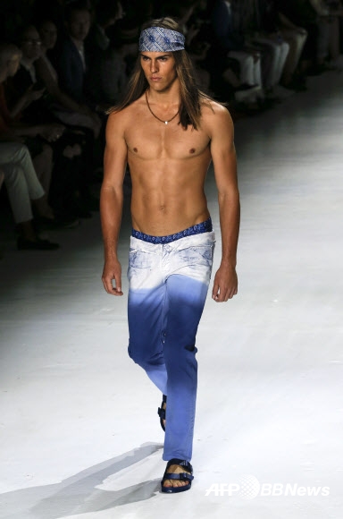 16일(현지시간) 미국 뉴욕 패션 위크에서 남성의류 브랜드 ‘파크 앤드 로넨(Parke and Ronen)’의 작품을 잘빠진 모델들이 선보이고 있다.