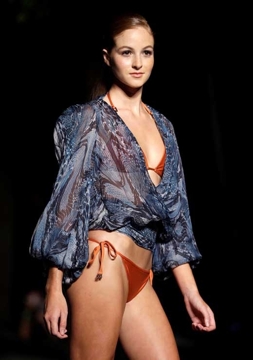 A model walks down the runway during the Sinesia Karol swimwear show as part of Funkshion Fashion Week Swim, Friday, July 17, 2015, in Miami Beach, Fla.