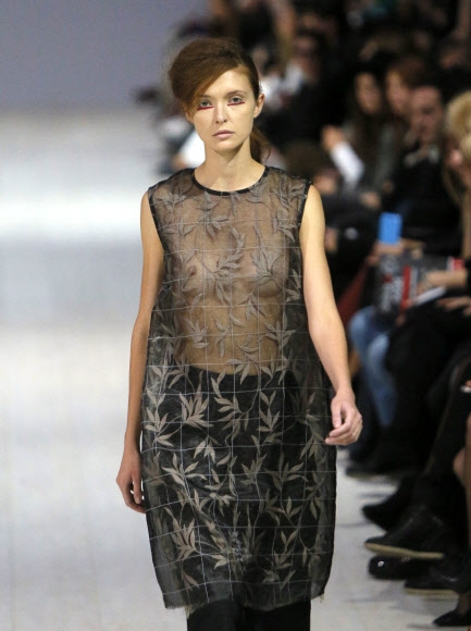 15일(현지시간) 우크라이나 패션 위크 동안 그루지아 디자이너 아카 나니타의 작품을 모델이 입고 런웨이를 걷고 있다.