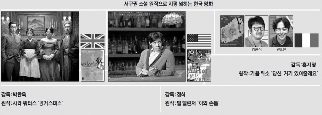 영화와 소설은 떼려야 뗄 수 없는 관계다. 수많은 유명 소설들이 영화로 만들어졌다. 1970년대까지 이른바 문예 영화가 큰 흐름을 이루기도 했다. 소설의 영화화는 올해도 예외는 아니다. ‘고산자’(박범신), ‘7년의 밤’(정유정), ‘살인자의 기억법’(김영하), ‘순정’(한창훈), ‘덕혜옹주’(권비영), ‘종료되었습니다’(박하익) 등이 스크린으로 줄달음칠 예정이다. 이런 가운데 우리와는 문화권이 다른 미국, 유럽의 소설이 잇달아 국내에서 영화로 만들어지고 있어 눈길을 끈다. 그간 해외로는 일본, 중국 쪽에 관심을 두던 한국 영화가 영감을 얻는 저변이 더욱 넓어지고 있다는 평가가 나온다.