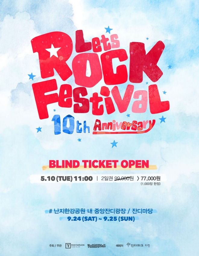 특히 올해는 10주년을 기념하며 한강 난지공원에서 대규모로 개최될 예정이라 2016 렛츠락 라인업에 벌써부터 많은 기대가 모아지고 있다. 오는 9월24~25일 한강 난지공원에서 열리는 2016 렛츠락의 블라인드 티켓은 금일 오전 11시 티켓구매 사이트 인터파크를 통해 판매된다.