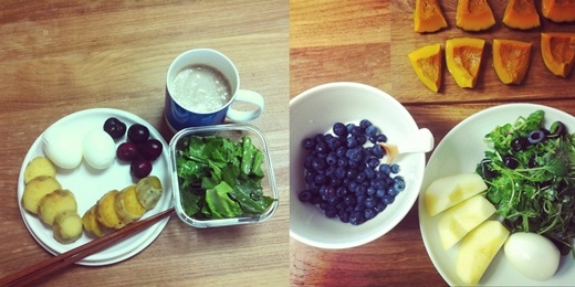 또 다른 사진에는 블루베리요거트, 사과, 올리브샐러드, 삶은계란, 단호박 등 저칼로리 식단이 담겨져 있다.