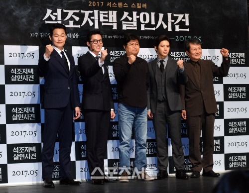 10일 서울 압구정CGV에서 열린 영화 ‘석조저택 살인사건’ 제작보고회에는 김휘 감독과 배우 고수 김주혁 문성근 박성웅이 참석했다.