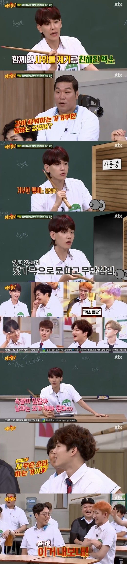 이날 방송에서 백현은 멤버들과 친해지기 위해 ‘일대일 샤워’를 했다고 고백했다.