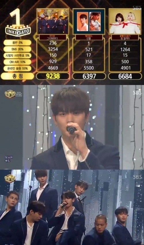 비투비는 29일 방송된 SBS ‘인기가요’에서 타이틀곡 ‘그리워하다’로 볼빨간사춘기의 ‘썸 탈꺼야’와 멜로망스의 ‘선물’을 꺾고 1위를 차지했다.