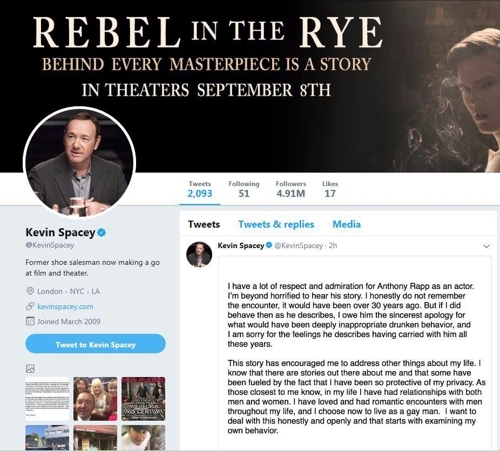 스페이시의 갑작스러운 커밍아웃은 최근 ‘스타트렉 디스커버리’에 출연 중인 동료 배우 앤서니 랩이 미성년자였던 1980년대에 스페이시로부터 성추행을 당했다고 폭로한 데서 비롯됐다.