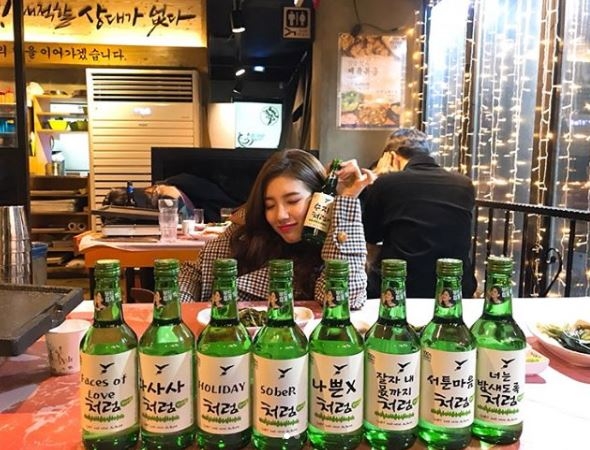 수지는 또 소주 여러 병과 함께 찍은 사진을 공개하며 “처음처럼 따랑해요”라고 전했다.