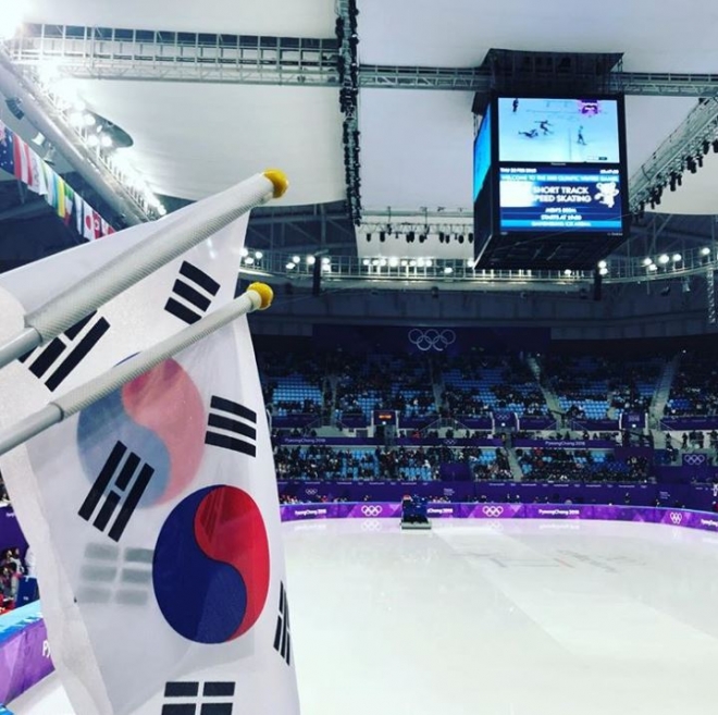 사진에는 이날 쇼트트랙 경기가 열린 강릉 아이스아레나 내부 모습과 두 개의 태극기가 담겼다.