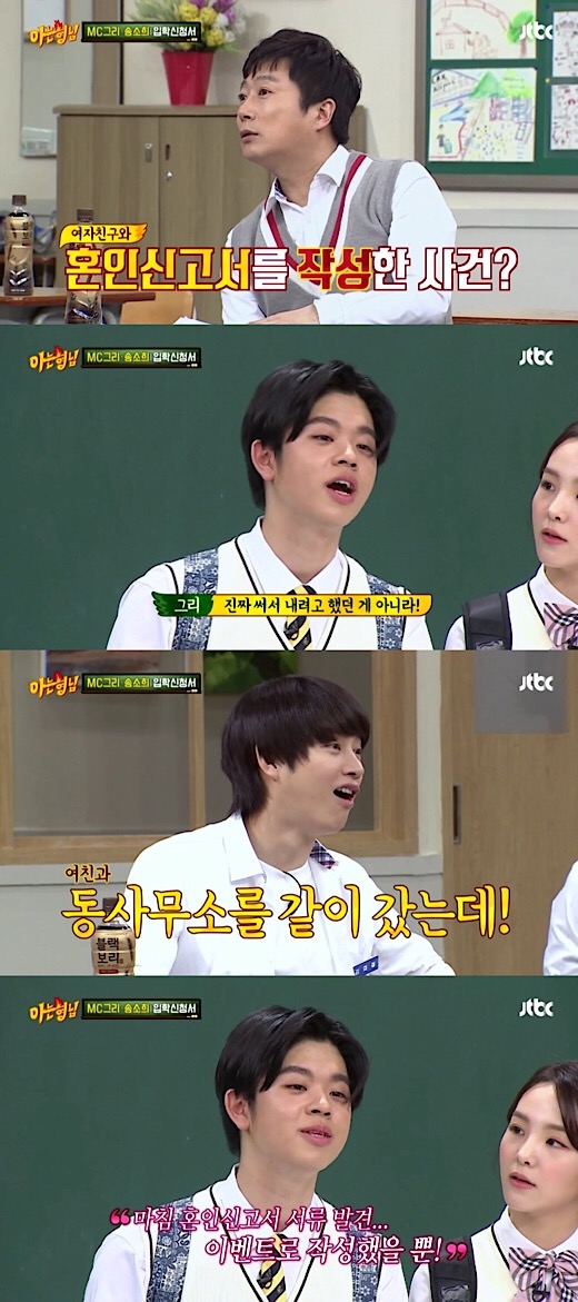 현재 공개 열애 중인 MC그리는 이날 방송에서 “여자친구와 동사무소에 갔다가 혼인신고서가 있어서 작성했다”고 밝혀 출연진들을 놀라게 했다.