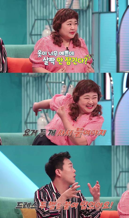앞서 진행된 녹화에서 홍윤화는 “옷이 너무 마음에 드는데 살짝 안 잠기면 두 벌을 수선해 붙여 입으면 된다”며 자신만의 옷 입는 노하우를 털어놨다.
