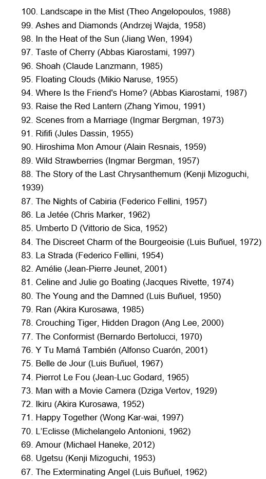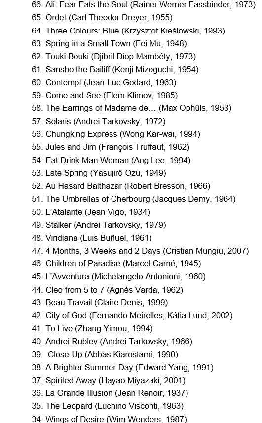 역시나 프랑스어가 27편으로 가장 많았고 만다린(중국어)가 12작품, 이탈리아와 일본어 작품이 나란히 11편, 박찬욱 감독의 한국과 벨라루스, 루마니아, 볼로프가 한 작품씩 선정됐다. 여성이 메가폰을 잡거나 공동 연출한 작품은 네 편에 불과했다. 투표에 참가한 여성 비평가가 94명으로 전체의 45%를 차지했는데도 이런 결과를 낳았다.