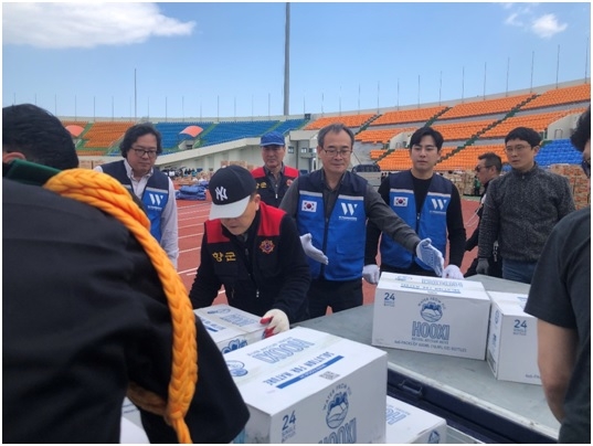 더블유재단은 강원도 산불 재해 지역 이재민을 위해 강원도청과 협력하여 피해 지역에 필요한 천연암반수 후시워터를 전달했다.