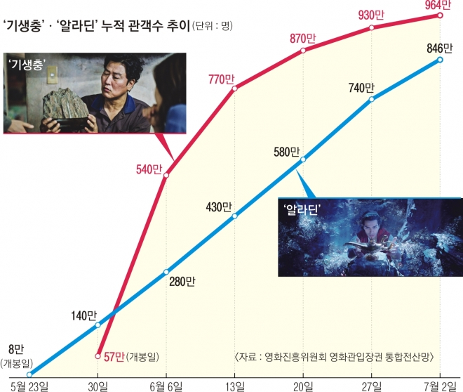 ‘기생충’·‘알라딘’ 천만 관객 주말 고비