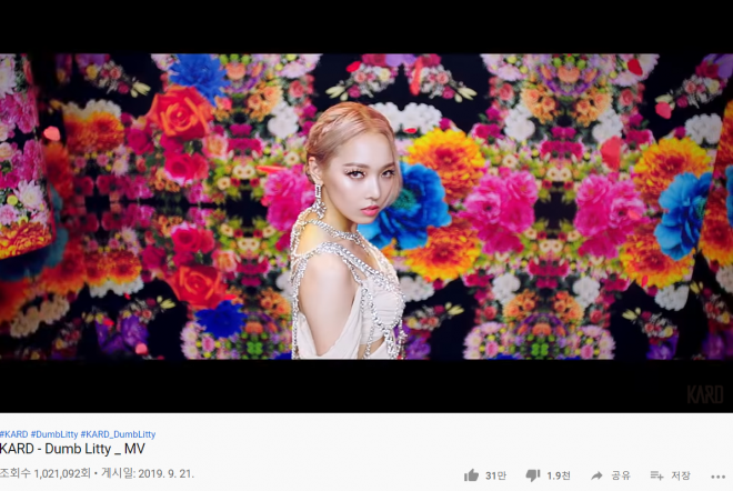 혼성그룹 KARD(BM, 제이셉, 전소민, 전지우)의 2번째 싱글 ‘덤 리티’(Dumb Litty) 뮤직비디오가 공개 12시간여 만에 100만뷰를 돌파했다.