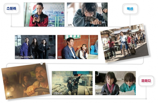 외국 영화의 반격도 거세다. 지난 23일 개봉한 ‘아웃포스트´는 사방이 산으로 막혀 있는 평지에 기지를 구축하고 살아남고자 애쓰는 미군 부대원들의 이야기다. 저격병이 숨어 총을 쏘면 꼼짝없이 당하는 곳에서 ‘탈레반’이라 칭하는 아랍 청년들이 기지를 향해 총을 난사하곤 한다. 롱테이크 기법과 생생한 사운드로 몰입감을 제공한다.