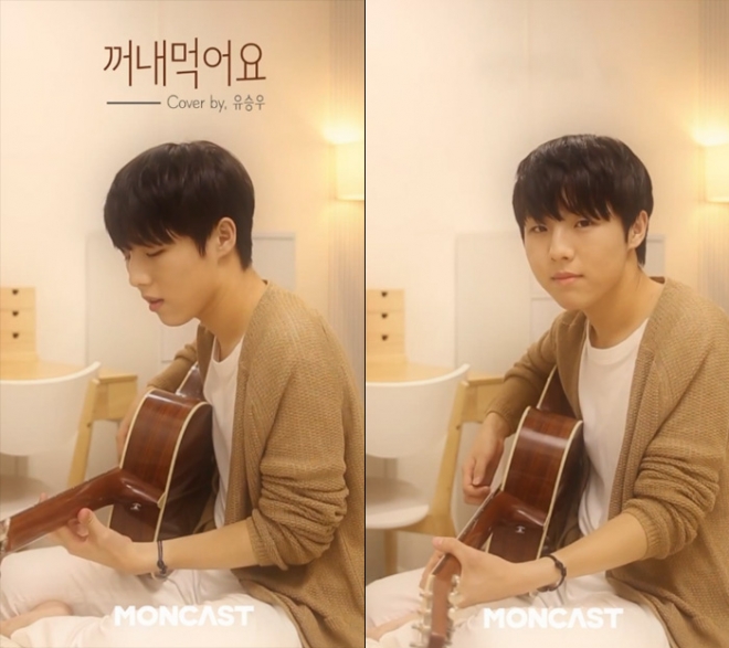 28일 모바일앱 몬캐스트를 통해 공개된 유승우의 ‘꺼내 먹어요’ 커버 영상에는 어쿠스틱 기타를 연주하며 감미로운 목소리로 노래를 부르는 유승우의 모습이 담겨 있다. 특히 카디건 차림의 편안한 복장으로 수줍은 듯하면서도 뜨거운 눈빛을 발산하는 유승우의 모습은 달달한 매력을 선사한다.