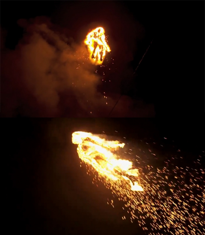 공개된 영상에는 ‘휴먼 토치’를 연상케 하는 화염으로 덮인 인간 형체의 드론이 어두운 밤하늘을 자유롭게 비행하는 모습이 담겼다.
