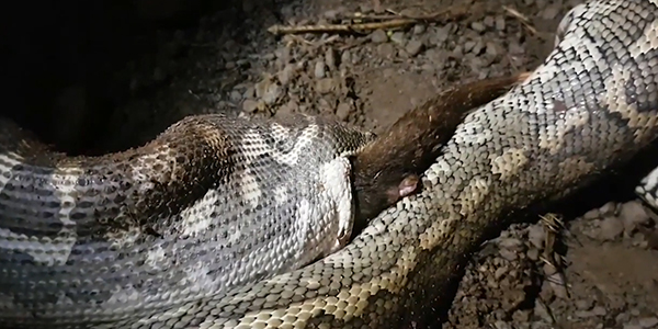영상에는 비단뱀이 포섬의 몸통을 압박한 채 천천히 삼키는 모습이 담겨 있다.