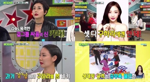 이어 “구하라는 한 번 공격을 받으면 승부욕이 발동하는 스타일”이라며 “아이돌에 대한 신비감이 사라졌다. 내가 붙었던 사람이 김나영, 정주리, 김새롬이었는데 셋 다 구하라한테 안 됐다”고 이야기했다.